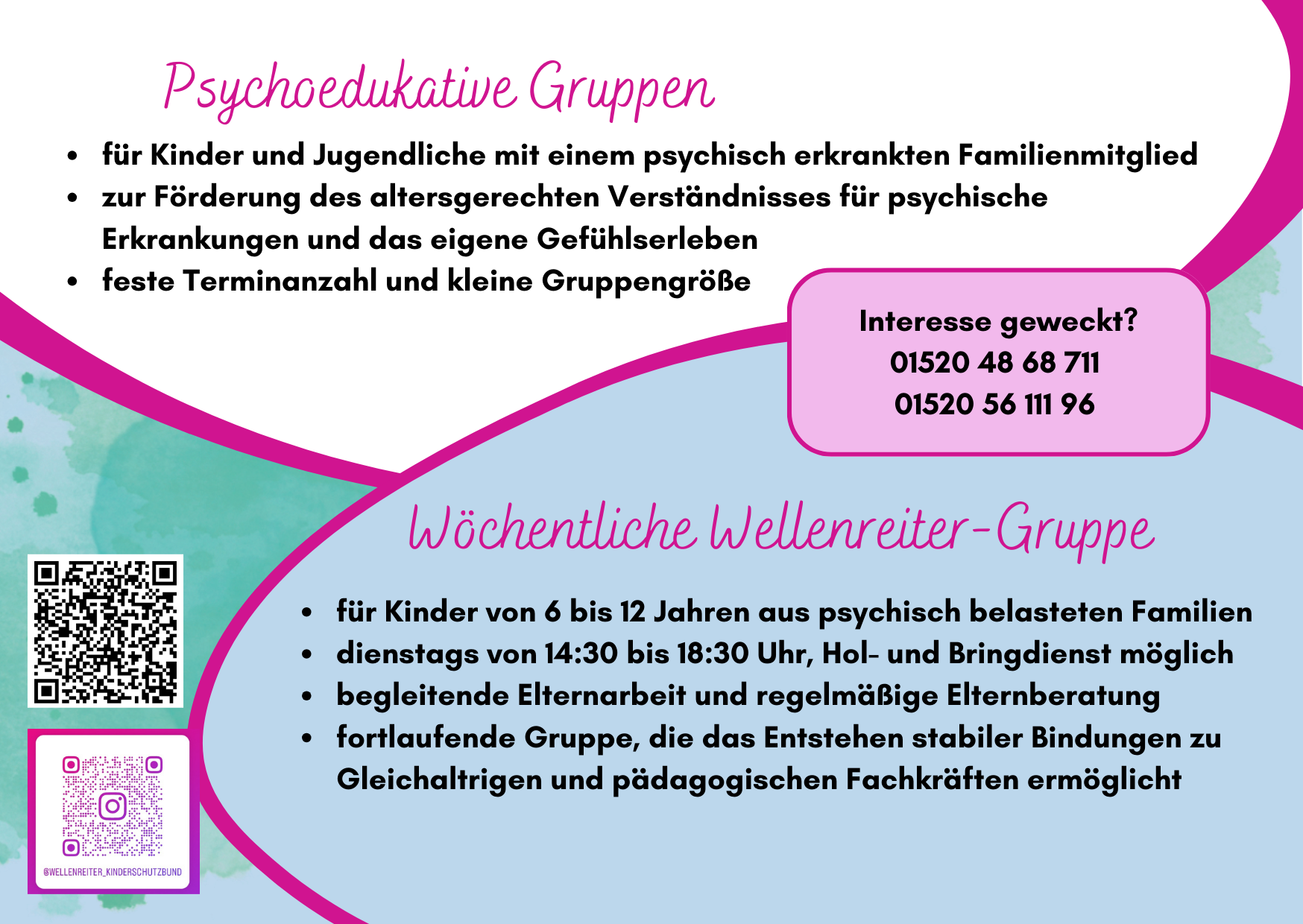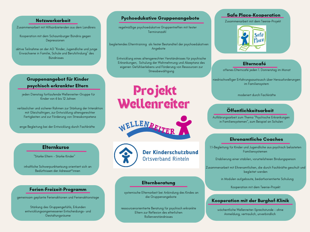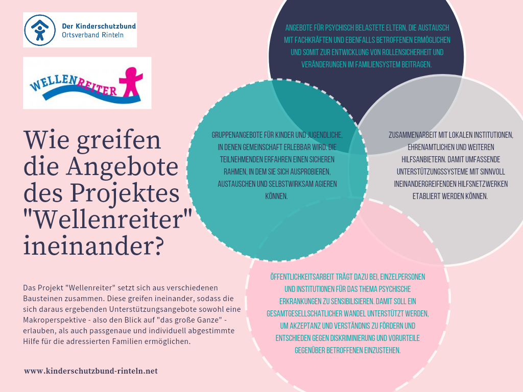 Seit 2018 bietet das „Projekt Wellenreiter“ des Kinderschutzbundes einen niedrigschwelligen Anlaufpunkt für Familien, die psychisch belastet sind oder in denen psychische Erkrankungen auftreten.