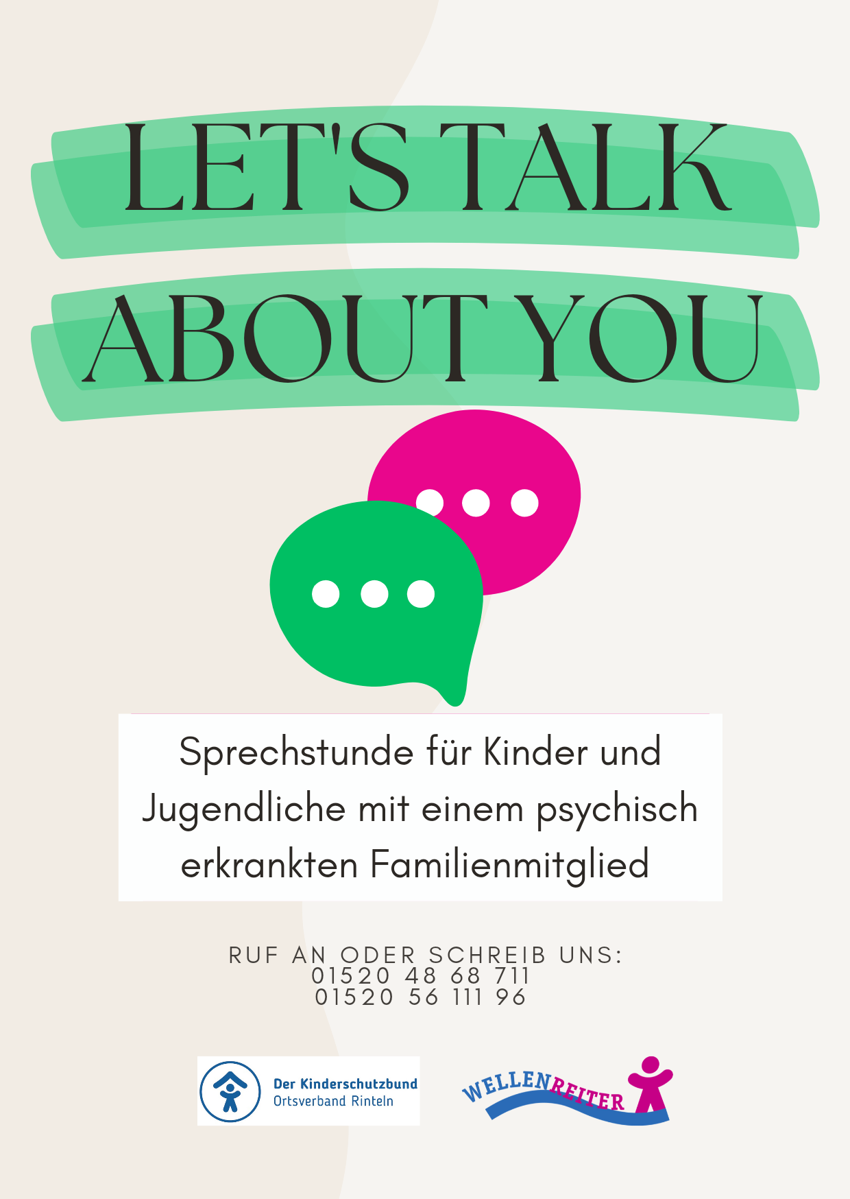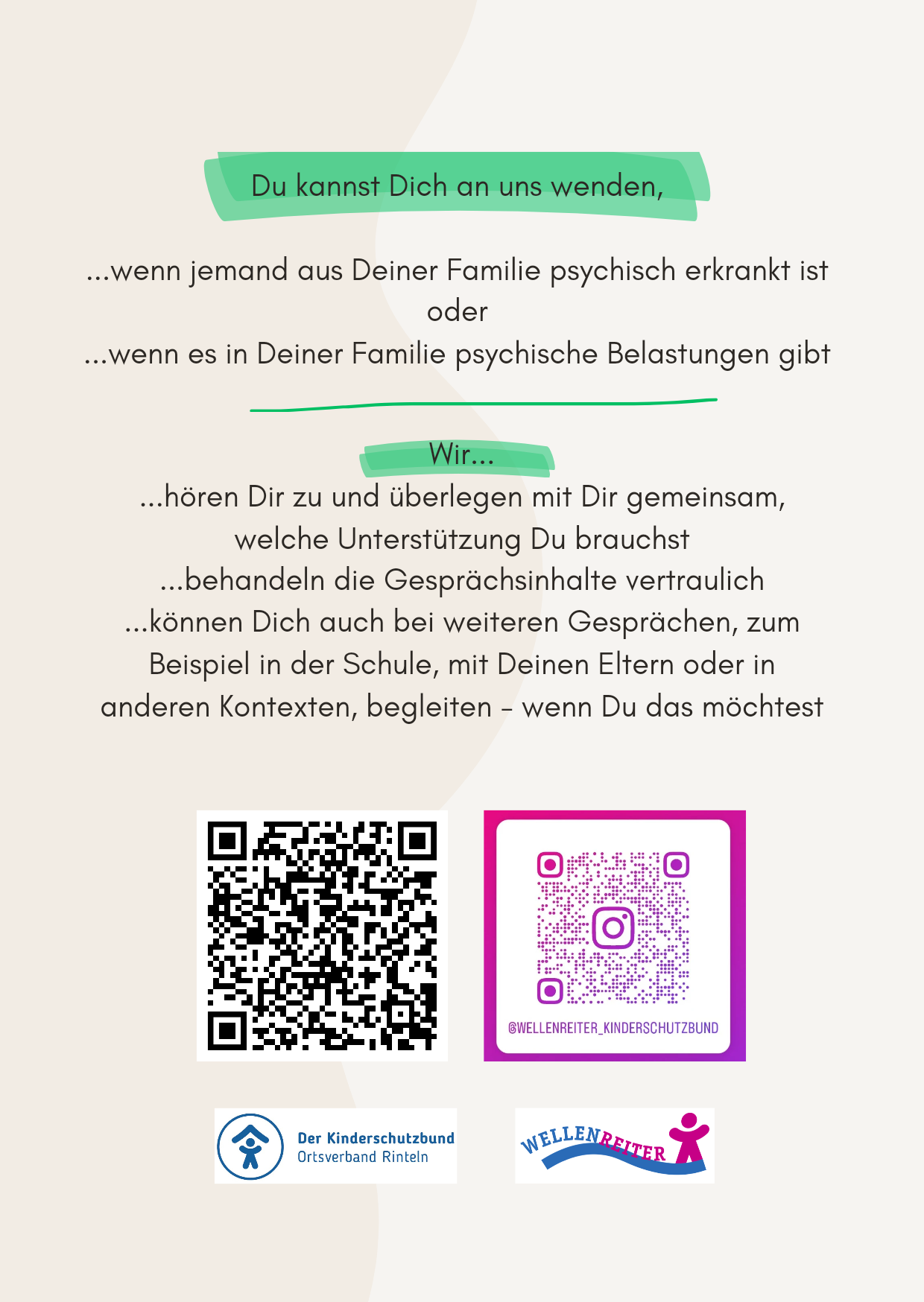 Kinder und Jugendliche aus psychisch belasteten Familiensystemen können niedrigschwellig telefonisch, per SMS oder über WhatsApp Kontakt zu den Fachkräften des Projektes „Wellenreiter“ aufnehmen.